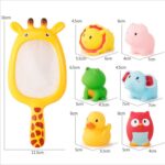 – 1PCS Net Fishing +12PCS Rubber Floating Toy +2PCS Swimming Ring – The cute cat shape of net fishing can be adsorbed on the wall, bathtub, playing shooting games or as a storage bag, it is a good choice. – Rubber floating sounding toy. Classic choice of bathroom toys.
