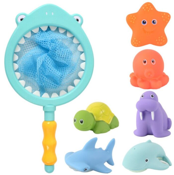– 1PCS Net Fishing +12PCS Rubber Floating Toy +2PCS Swimming Ring – The cute cat shape of net fishing can be adsorbed on the wall, bathtub, playing shooting games or as a storage bag, it is a good choice. – Rubber floating sounding toy. Classic choice of bathroom toys.